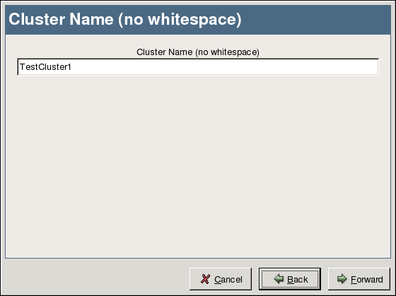 After reading the introductory screen describing the functionality of the GFS Setup Druid, click Forward to continue. You are then prompted to type a name for the GFS cluster. You can enter any name that does not contain spaces. (such as Development1 or Engineering_Cluster). Click Forward to continue.