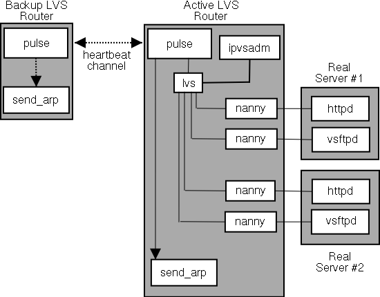 The pulse daemon runs on both the active and passive LVS routers. On the backup router, pulse sends a heartbeat to the public interface of the active router to make sure the active router is still properly functioning. On the active router, pulse starts the lvs daemon and responds to heartbeat queries from the backup LVS router.