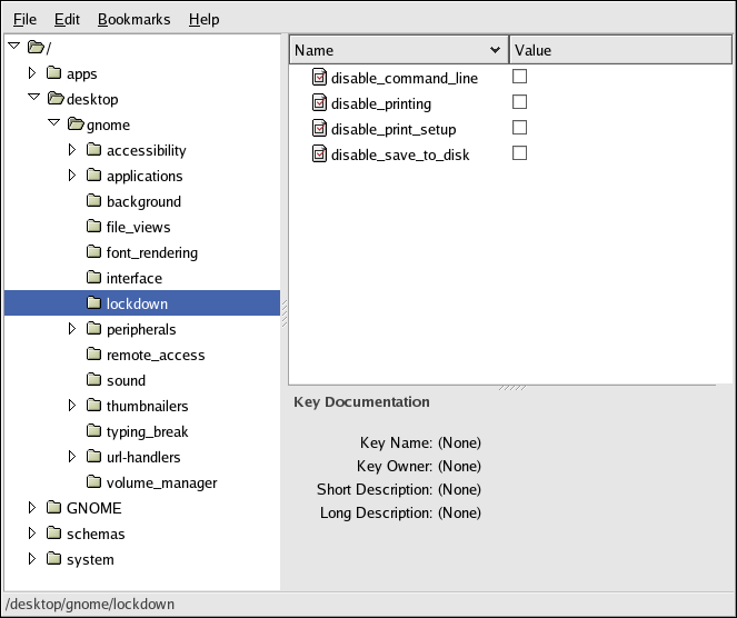 For more detailed information on GConf Editor, refer to the Configuration Editor Manual through Applications (the main menu on the panel) => Help, and by selecting the Applications Category, then the Utilities Category, and finally, by selecting the Configuration Editor Manual Document.