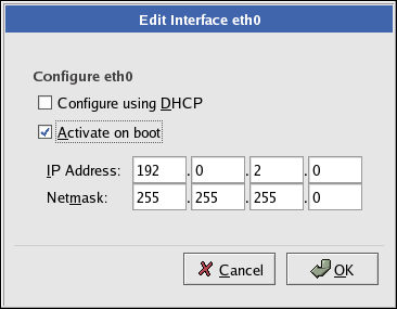 Once you have selected a network device, click Edit. From the Edit Interface pop-up screen, you can choose to configure the IP address and Netmask of the device via DHCP (or manually if DHCP is not selected) and you can choose to activate the device at boot time. If you select Activate on boot, your network interface is started when you boot. If you do not have DHCP client access or you are unsure what to provide here, please contact your network administrator.