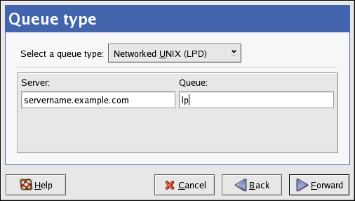 Select Networked UNIX (LPD) from the Select a queue type menu, and click Forward.